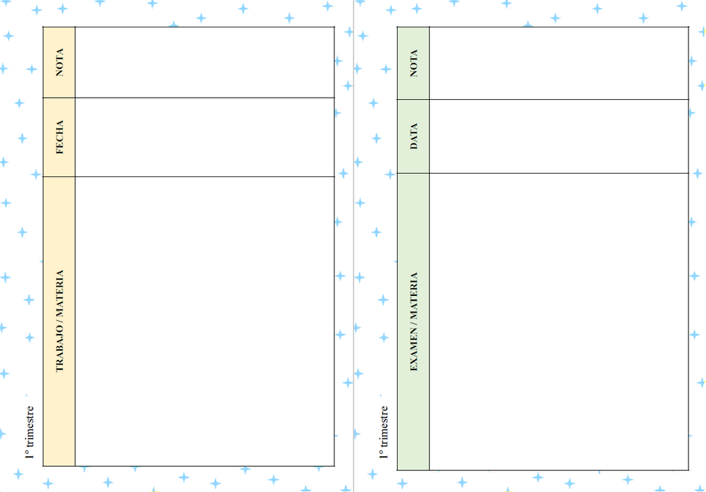 Agenda de estudiante organizada a semana vista. Incluye calendario anual, mensual, horario, tablas de trabajo y exámenes (una para cada trimestre), organización semanal y notas al final.