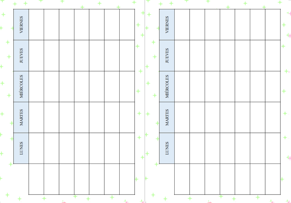 Agenda de estudiante organizada a semana vista. Incluye calendario anual, mensual, horario, tablas de trabajo y exámenes (una para cada trimestre), organización semanal y notas al final.
