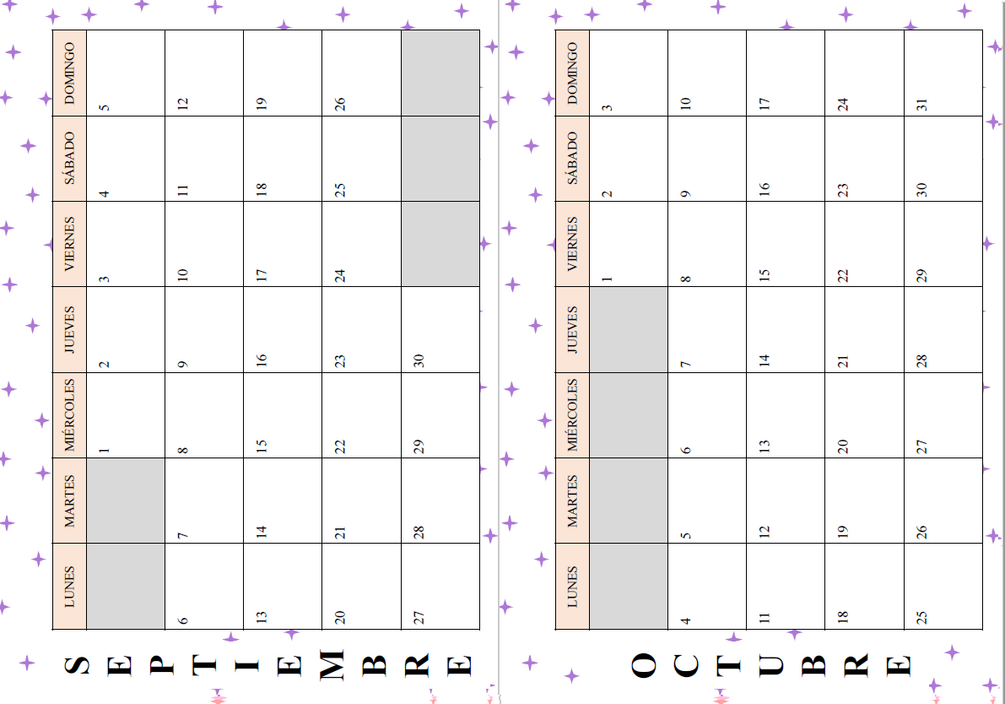 Agenda de estudiante organizada a día vista. Incluye calendario anual, mensual, horario, tablas de trabajo y exámenes (una para cada trimestre), organización semanal y notas al final.