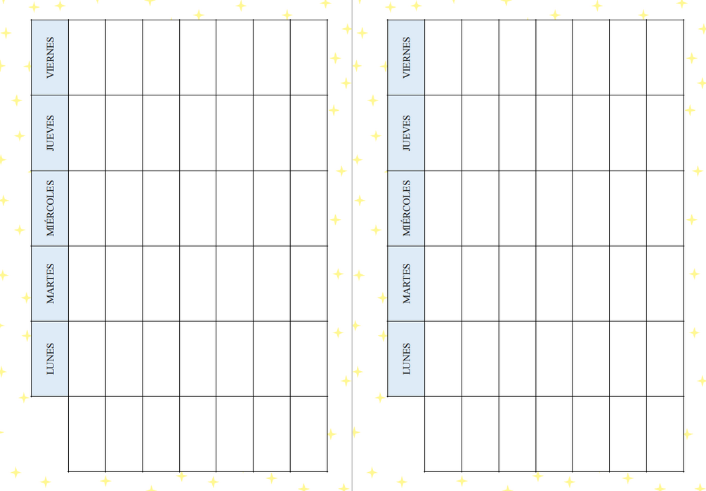 Agenda de estudiante organizada a día vista. Incluye calendario anual, mensual, horario, tablas de trabajo y exámenes (una para cada trimestre), organización semanal y notas al final.