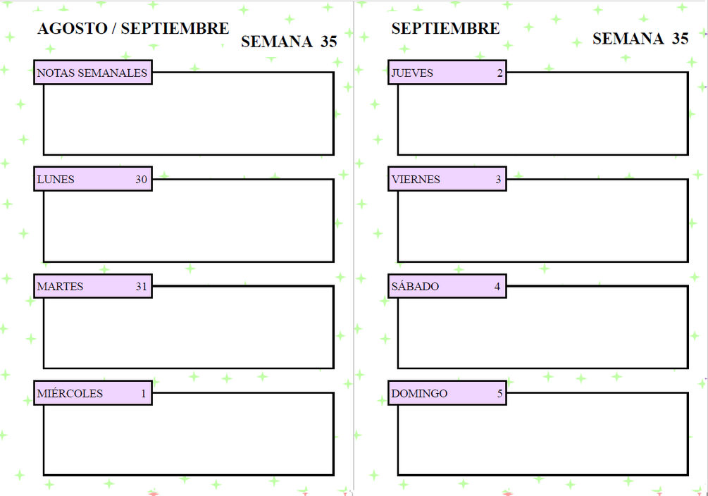 Agenda a semana vista. Incluye calendario anual, mensual, organización semanal y notas al final.